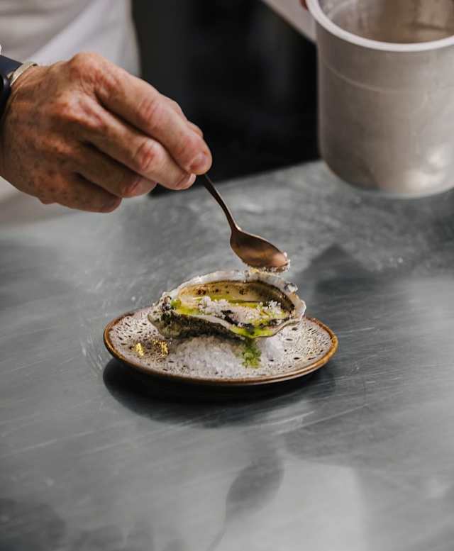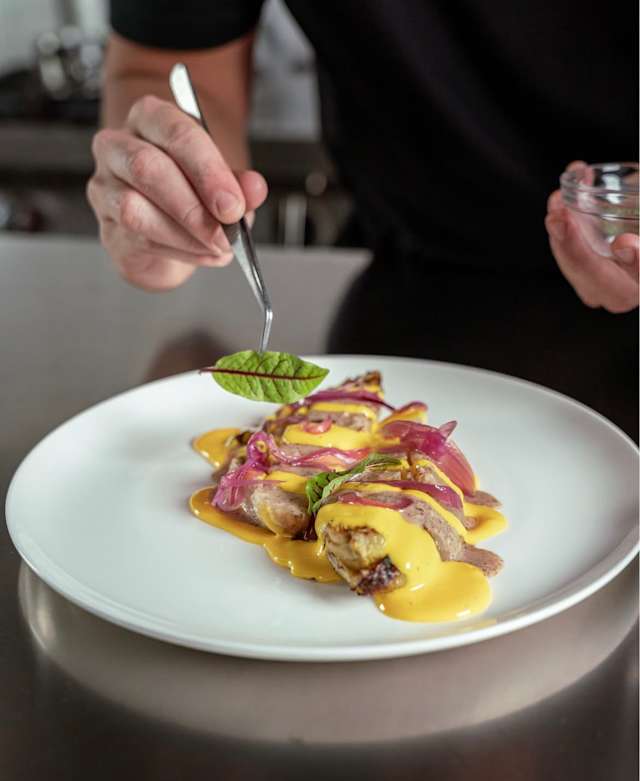 - Animella fritta, salsa carota e zenzero, fondo bruno di pecora, mizuna del nostro orto