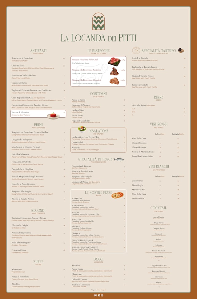 Dear Guest, Thank you so much for your kind words and recommendation! We’re delighted you enjoyed both our food and service, and that our menu — from Florentine steak to pastas and pizzas — met your expectations. We hope to welcome you back to Locanda dei Pitti on your next visit to Florence! Warm regards, The Locanda dei Pitti Team