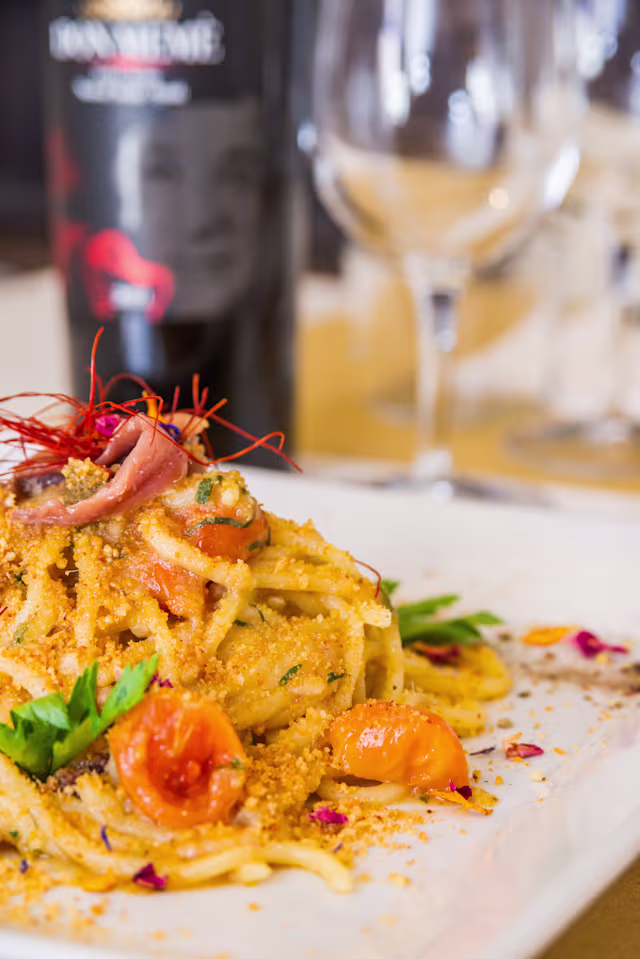 - Trofie al pesce spada, melanzane,ciliegino, menta e mandorle croccanti