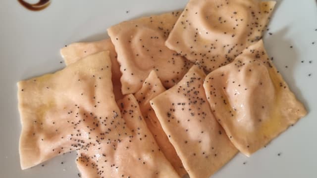 Agnolotti fatti a mano ripieni di ricotta e castelmagno saltati con crema di peperone al profumo di camomilla