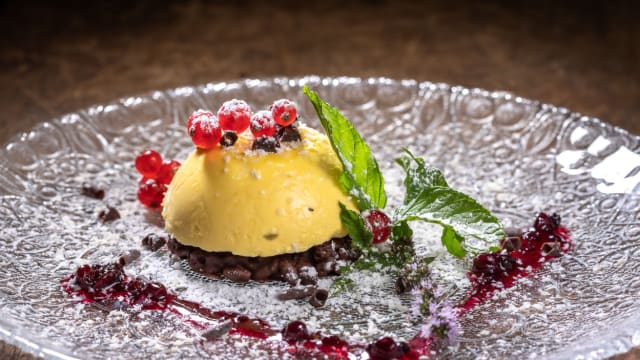 Mezza sfera ai Limoni di Sicilia con cialda croccante di cioccolato fondente e riso soffiato,coulis di fragole