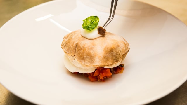 Calamaro grigliato, acqua di pomodoro, pomodoro alla pantesca, mandorle e capperi croccanti