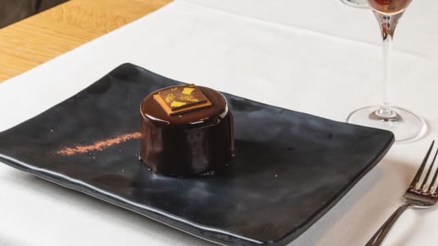 Morbido savoiardo al cioccolato, gianduja ai cereali, mousse al cioccolato fondente 72% pura origine madagascar, bavarese alle nocciole pralinate e veli di cioccolato