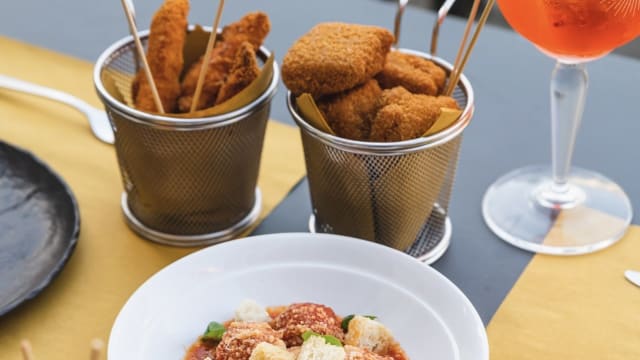 Polpa di pomodoro, mozzarella di bufala, melanzane fritte, grana padano DOP, basilico