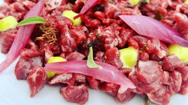 Tartar di pecora Brogna della Lessinia presidio “Slow Food” maionese al tuorlo d’uovo e caviale di aringa affumicato