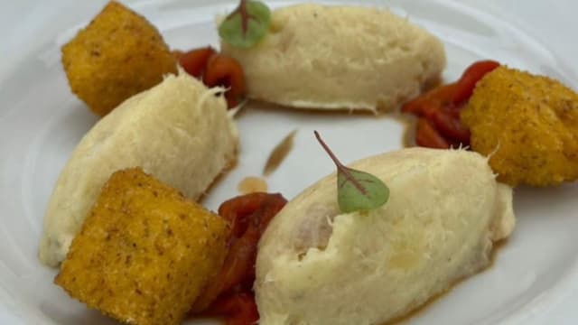 Cervella di vitello fritta, emulsione di acciuga, cipolla rossa marinata, capperi e limone