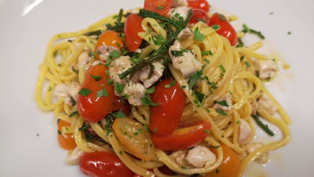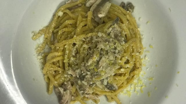 Spaghettone artigianale “lamiapasta” vongole bottarga di mugine e granella di pistacchio di bronte