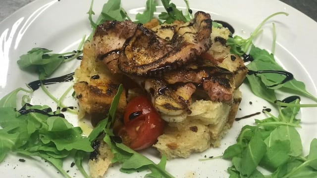 Tentacolo di polpo* cotto alla barese arrosticciato servito su passatina di ceci e cicoria aglio olio e peperoncino