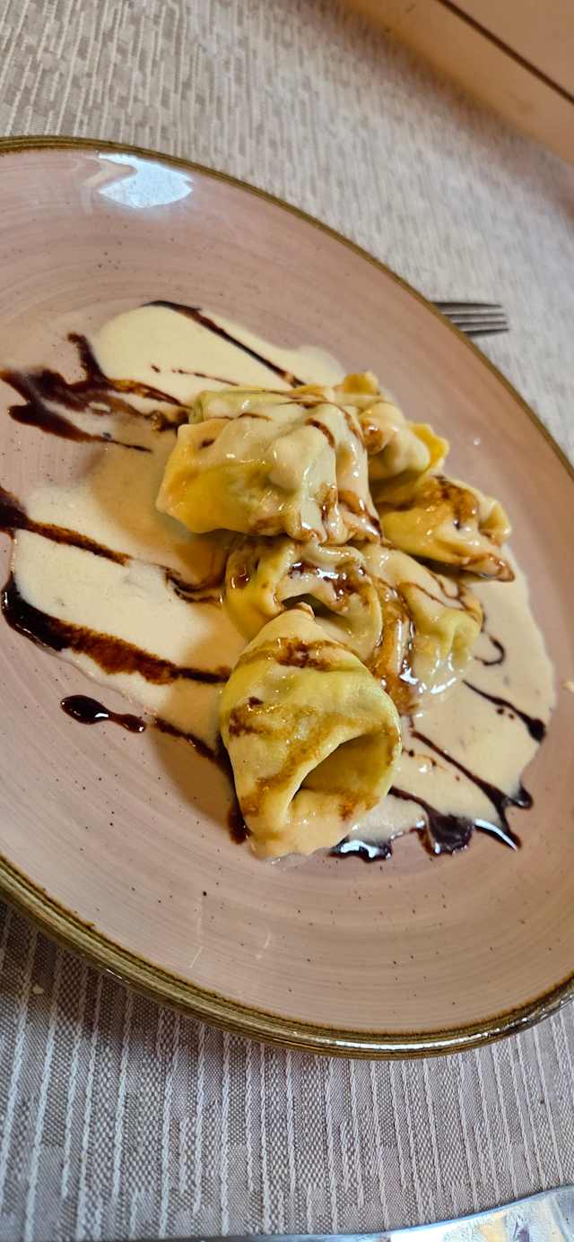 - Tortelloni ricotta e spinaci con crema di parmigiano accompagnato con aceto batsamico dop 12 anni