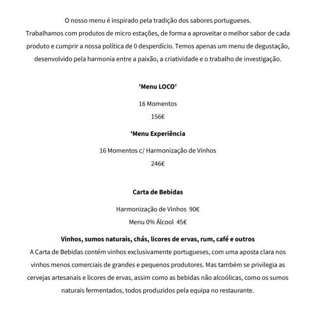 10/10+2My fiancé and I wanted to celebrate a special occasion with traditional Portuguese cuisine with a modern twist, and stumbled upon Loco for a 16 course meal. The staff was very respectful and fluent in English to answer any questions we had about the dishes. Coming from Boston and having been to many Michelin restaurants, the combinations of ingredients were some I’ve never imagined would go well together. My favorites were the black garlic purée, bao fried ball with peanut flour, and the smoked ham ice cream. There were also interesting ingredients that stood out like fermented red cabbage and coriander oil. The chefs really do show their passion through each dish. Would go again!