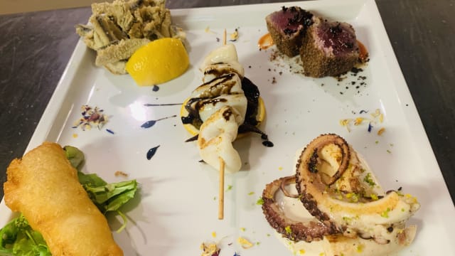 Polpo alla piastra su crema di patate , pomodorini e pinoli