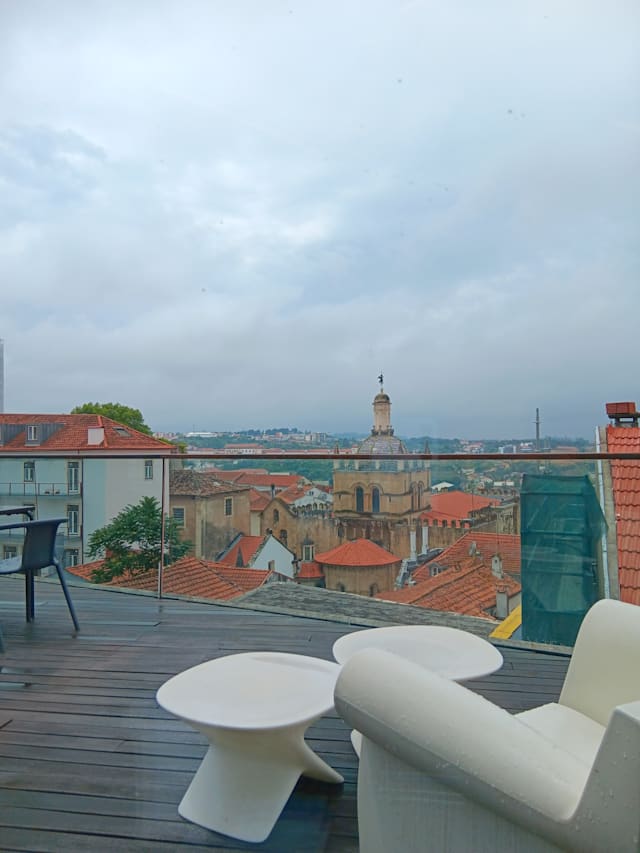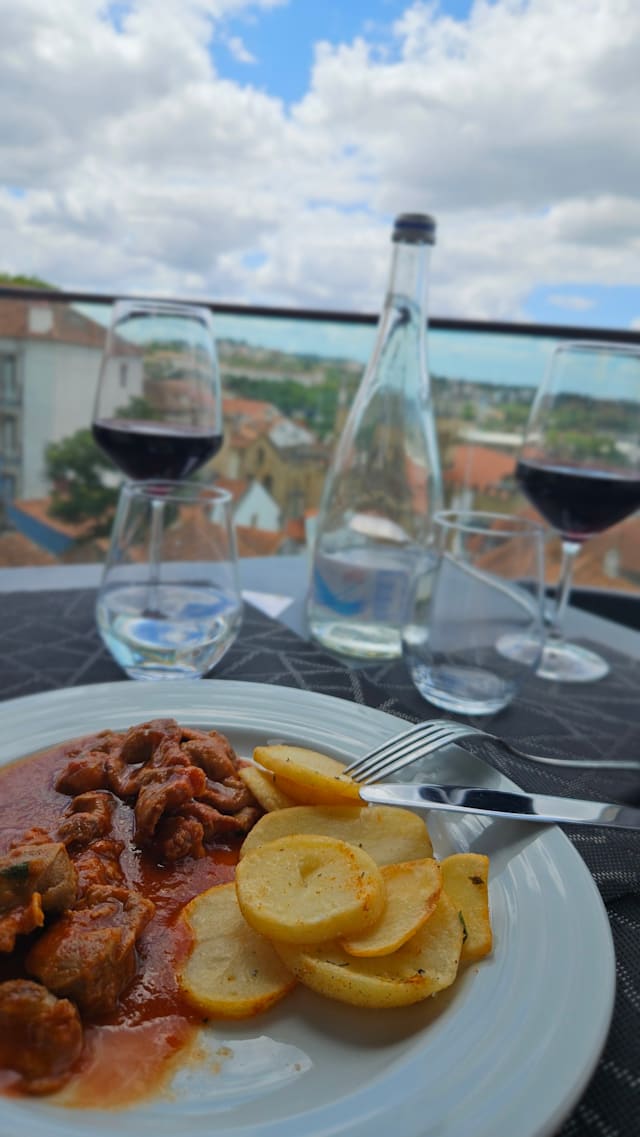 8/10We took a table for 4 outside on the balcony, the views are lovely, sunset over the Mondego river. The staff were friendly and accommodating. We ordered starters, prawns, veal pie, all very good. Main meals of calf, pork cheek, cod loin were all well cooked, good flavours, and just the right amount of choice on the menu. Tangerine sorbet, and chocolate mousse desserts were very good. Reasonable prices Chilled relaxed atmosphere, mellow jazz in the background and a good G&T. What more could you ask for?