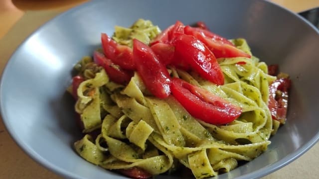 Tagliatelle al pesto di basilico con pomodorini e grana