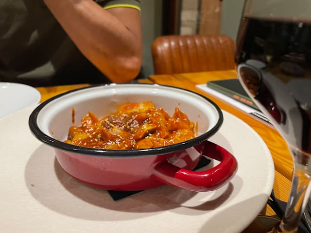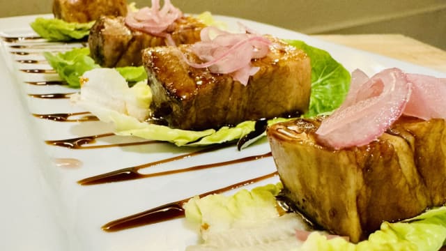 Morro i orella a baixa temperatura saltats amb salsa de garnatxa blanca i salsa bbq