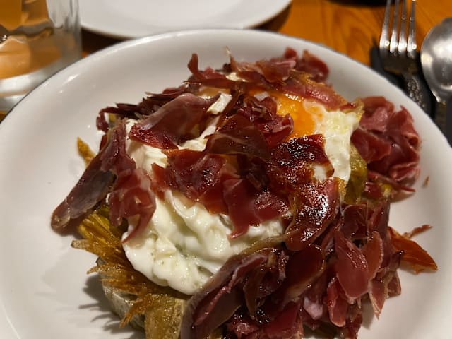 Carxofes amb ou ferrat i encenalls de pernil ibèric