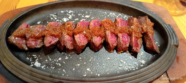 Magret d’ànec marinat amb salsa de soja, pebre de sichuan i miso vermell a la graella
