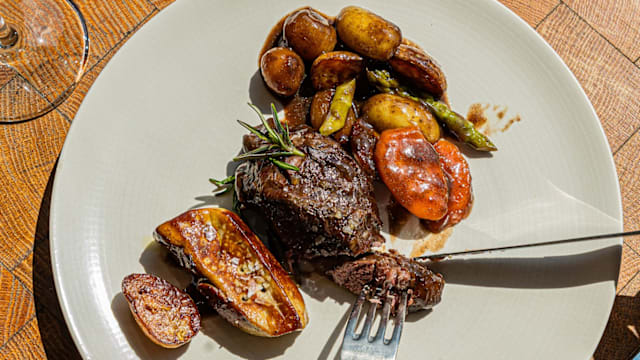 - Pluma, lagarto y secreto. Guarniciones a escoger: pimientos del piquillo confitados / patatas fritas / ensalada verde / cremoso de patata trufado.