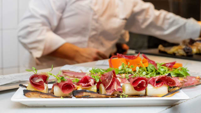 - Alcachofas y espárragos verdes confitados a la brasa con salsa de romesco