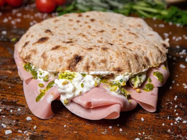 - Mortadella, squacquerone, pesto e granella di pistacchio