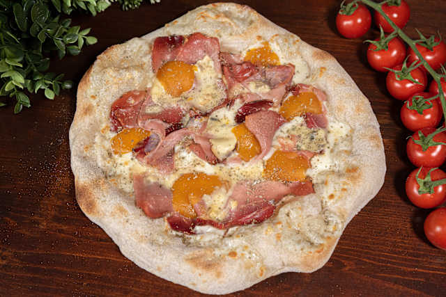 - Pomodoro, mozzarella, prosciutto cotto, salsiccia, funghi, carciofi, olive