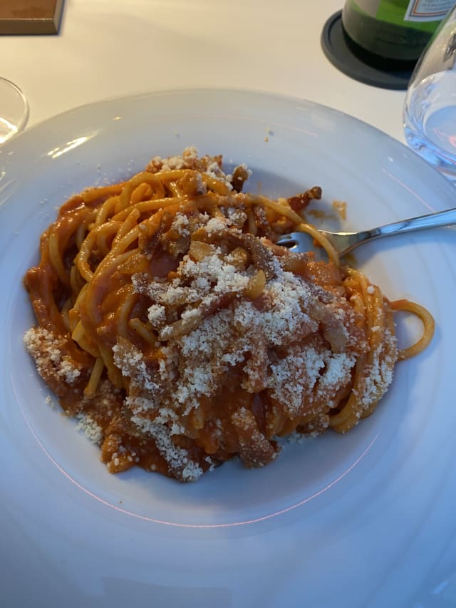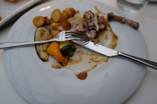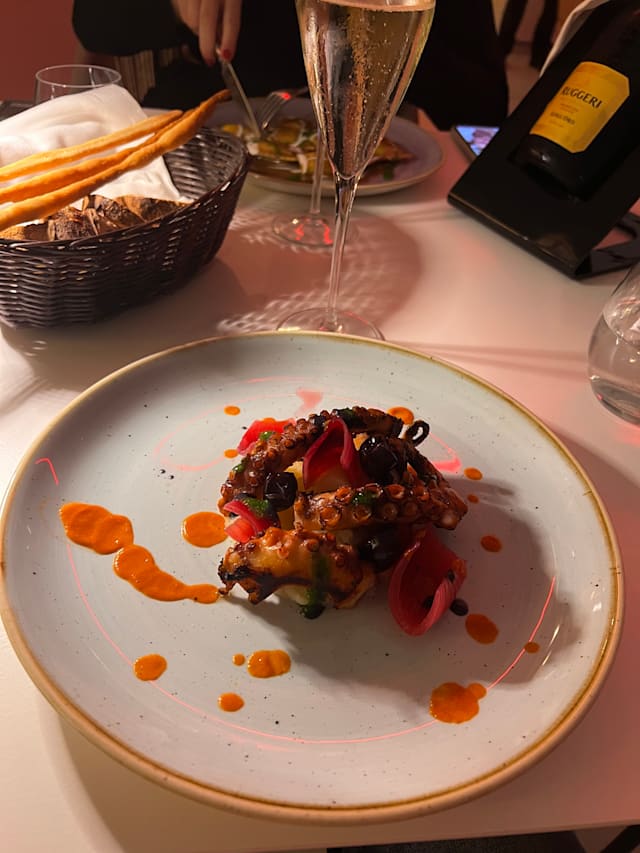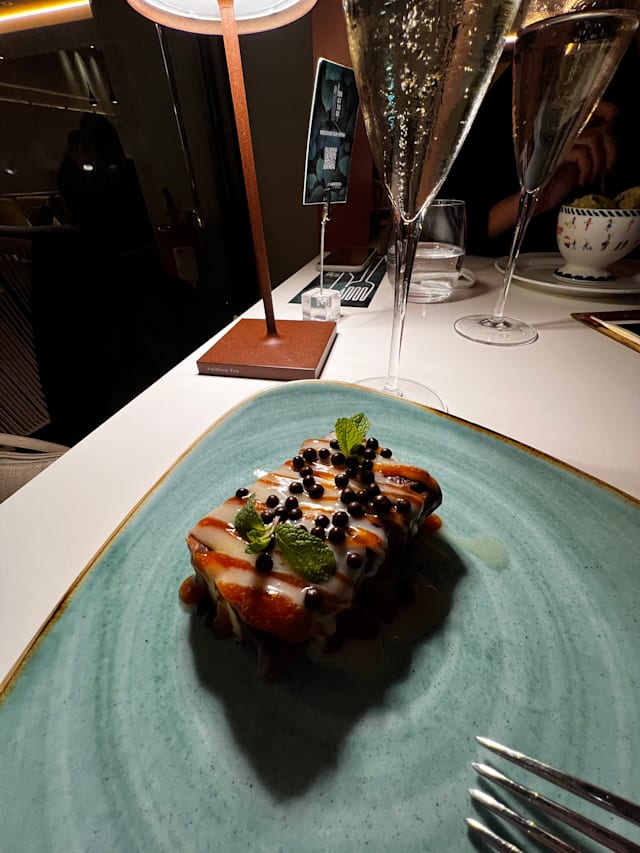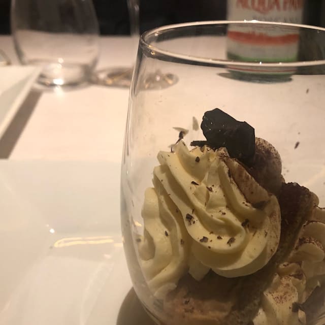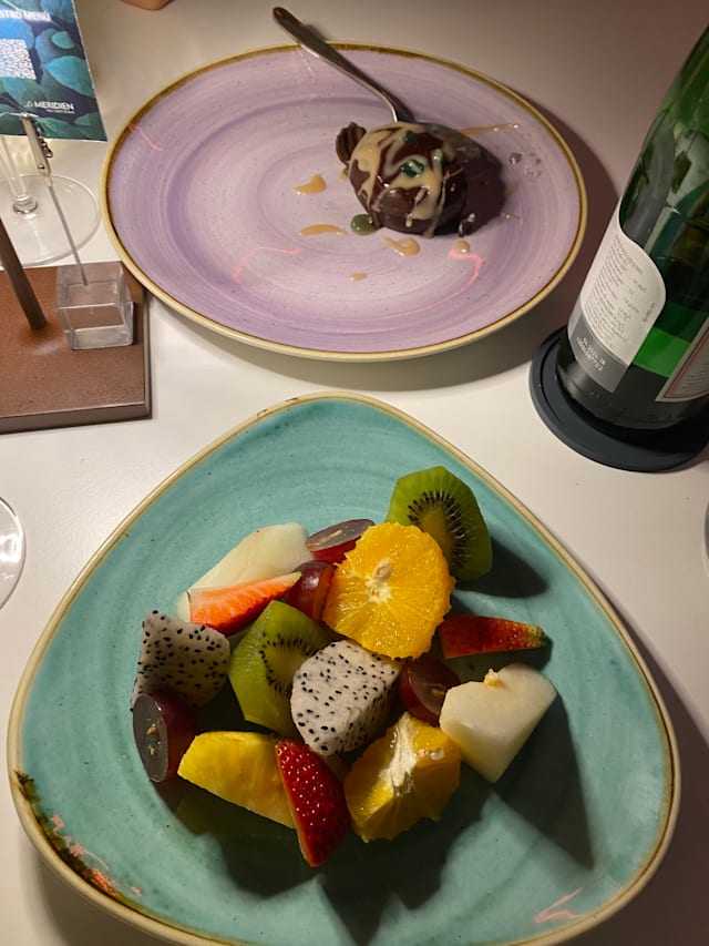 2.5/10This restaurant is behind the lobby of The Meridien Hotel which is not obvious from the online listings. The atmosphere is somewhat stark and the music in the restaurant competes with music from the lobby. The staff were exceptionally professional and welcoming, offering us two free glasses of prosecco after we sat down. Unfortunately, one of us bit into a small sharp metal hook or staple which was in our food. The staff were initially incredulous and then very apologetic. We felt unable to complete our meal. The staff removed the main courses from our bill, but we were charged for bread, water and starters. We won’t be going back.