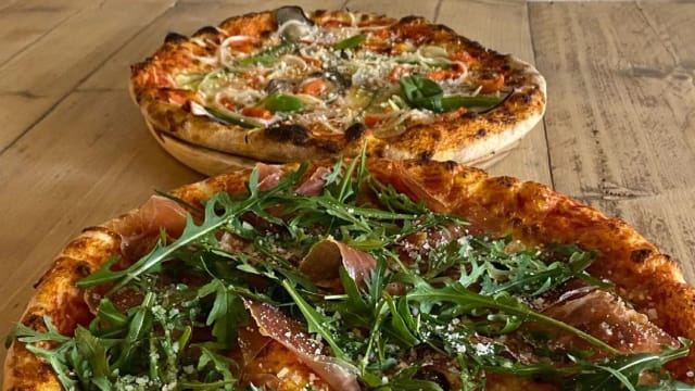 Mozzarella, tomate passata, paleta serrana duroc, rúcula y parmesano.