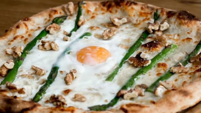 Mozzarella, espárragos trigueros, queso 100% de cabra, huevo, parmesano, nueces y aceite de trufa blanca.