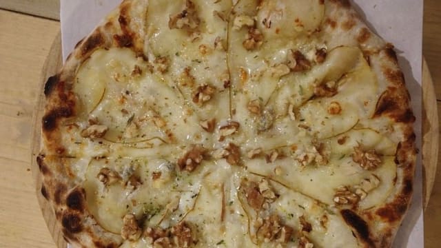 Mozzarella, pera conferencia, gorgonzola, próvola ahumada, nueces y orégano calabrés.