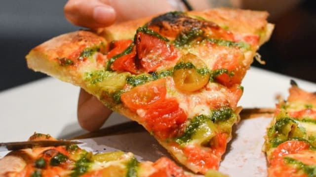 Mozzarella, tomate passata, tomate semiseco (rojo, amarillo y verde), tomate cherry y pesto casero.