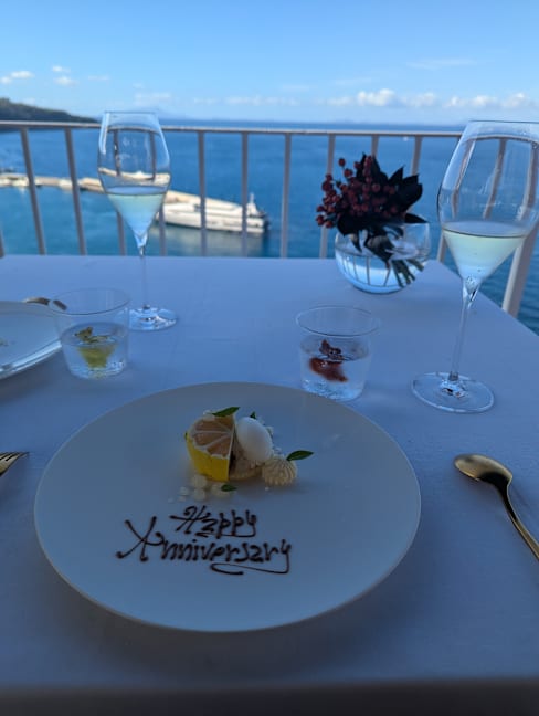 9.5/10Lovely location to celebrate our 30th wedding anniversary. I’m a vegetarian and my husband is not. Both of us had the preset menu one vegetarian option the other included meat and seafood with wine option~800 euro. The staff had to take my food back on multiple occasions since they presented meat. Our meals were delicious. We were disappointed that they didn’t even acknowledge our actual wedding anniversary date at check-in or during the entire meal. There was a lot of confusion amongst the staff for example we were asked what we wanted to order but no one had brought us a menu.