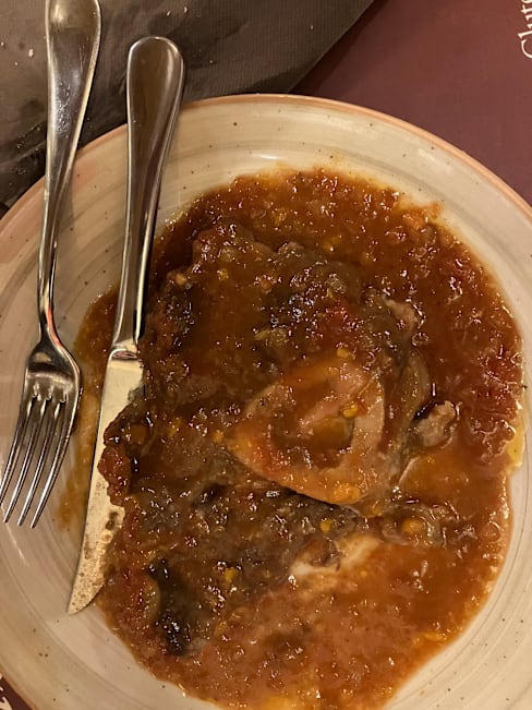 7/10My Airbnb owner recommended this place, so I had high hopes. My prosciutto and melon was very good, but the ossobucco was incredibly, almost comically, tough. Like I couldn’t cut it with a serrated knife, at all. I complained, and there was no problem replacing it with something else. But that of course entailed ordering something new, waiting for it to arrive, etc. I was eating on my own, so it made a solitary meal even longer and lonelier. The replacement steak was fine, the tiramisu afterwards a little generic. But that ossobuco!