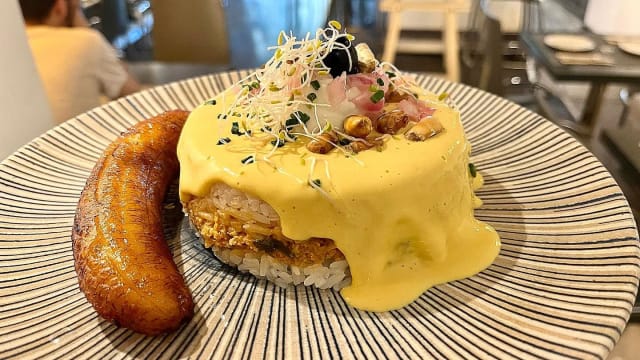 Plato reconocido en la gastronomía peruana, que inicialmente solía ser preparado a partir de los restos de frejoles y arroz. Nosotros los acompañamos de los más frescos mariscos de origen vegetal. Contiene trigo.