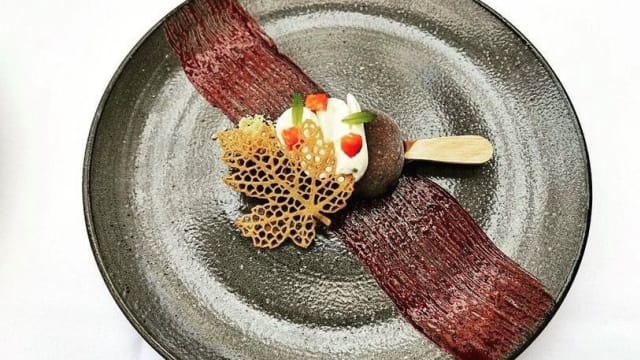- Ensalada de brotes tiernos, fresas, uvas, frutos secos, picatostes, cebolla morada, vinagreta de jerez, miel y lingote de queso de cabra templado
