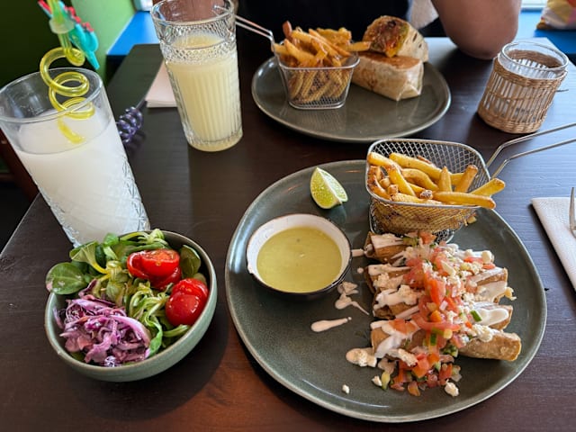 Riz, tomate, guacamole, cheddar, purée d’haricots, crème acidulée le tout roulé dans une tortilla, servi avec frites maison, coleslaw et viande au choix: effilochée de porc / effilochée de boeuf / poulet ip suisse / chili con carne / al pastor / chorizo / tofu bio / crevette