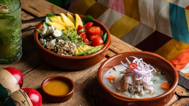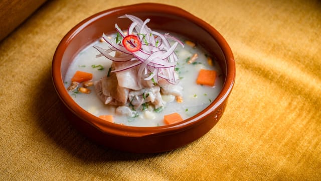 Daurade crue, poulpe, crevette et calamar frit, patate douce, mais choclo et cancha, oignon rouge, coriandre