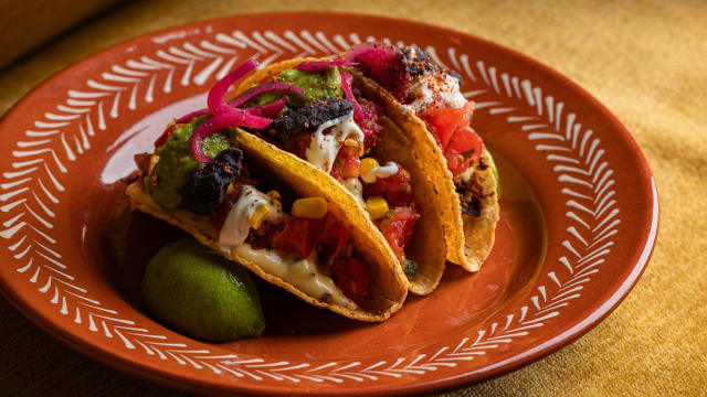 3 Tortillas de maïs croustillantes , garnie de bœuf ou poulet , salsa taquero, crème acidulée, fromage frais, pico de gallo & laitue