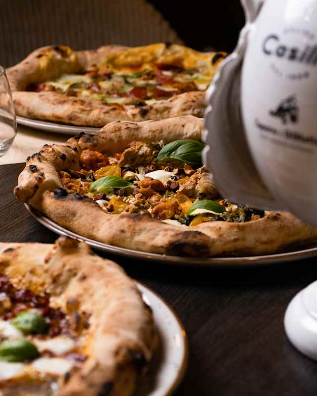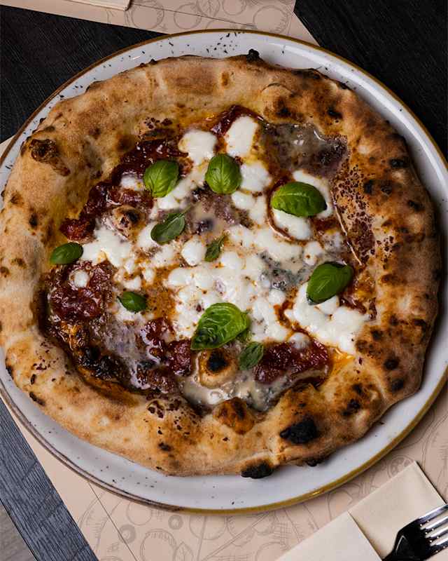 - Pomodoro pelato, fiordilatte caseificio pezzaviva, ventricina piccante, basilico fresco, olio evo