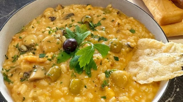 Mélange parfumé de basilic frais et d'olives noires dans un risotto fondant