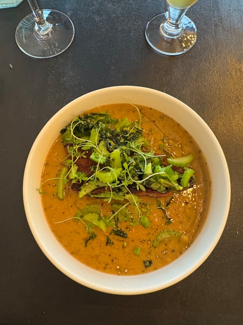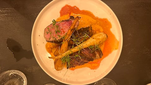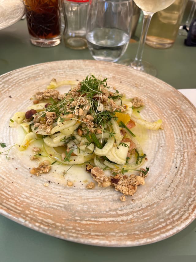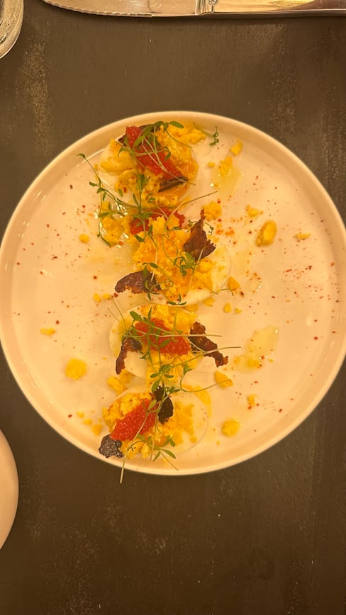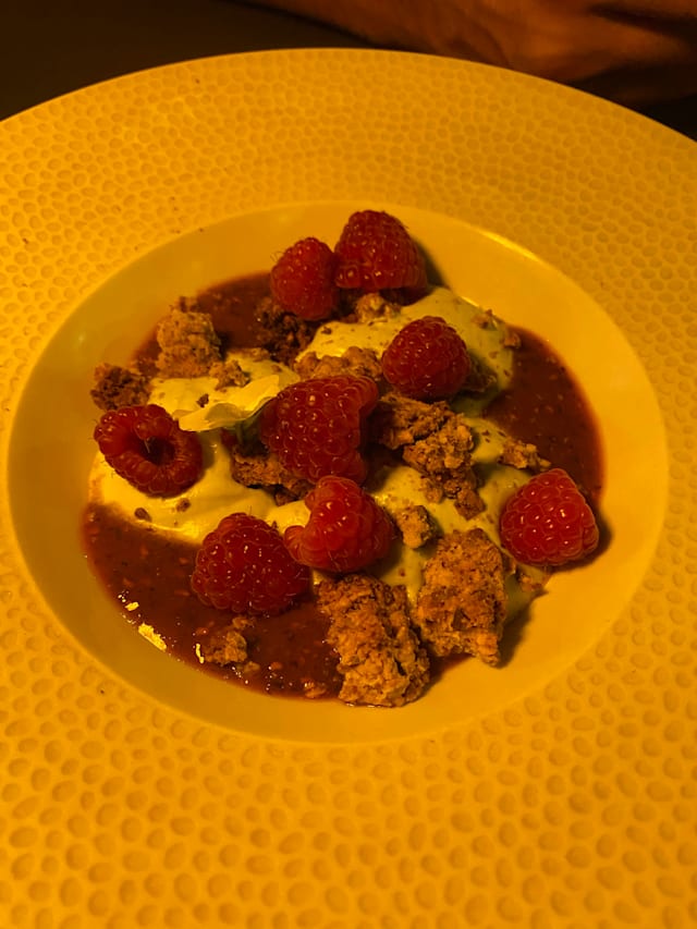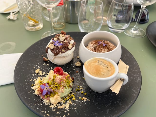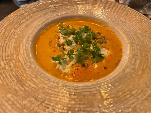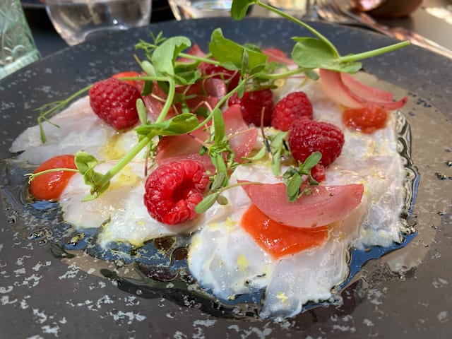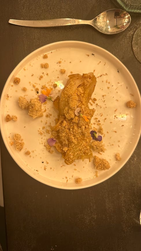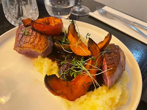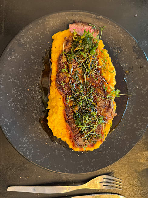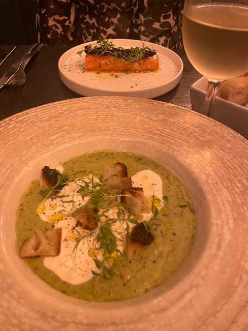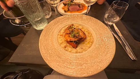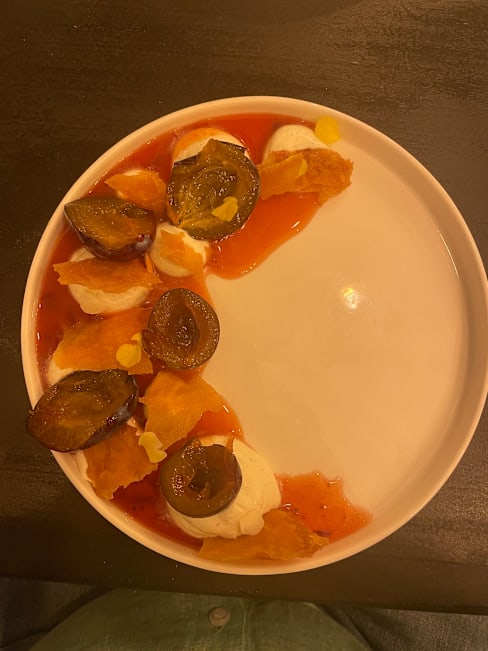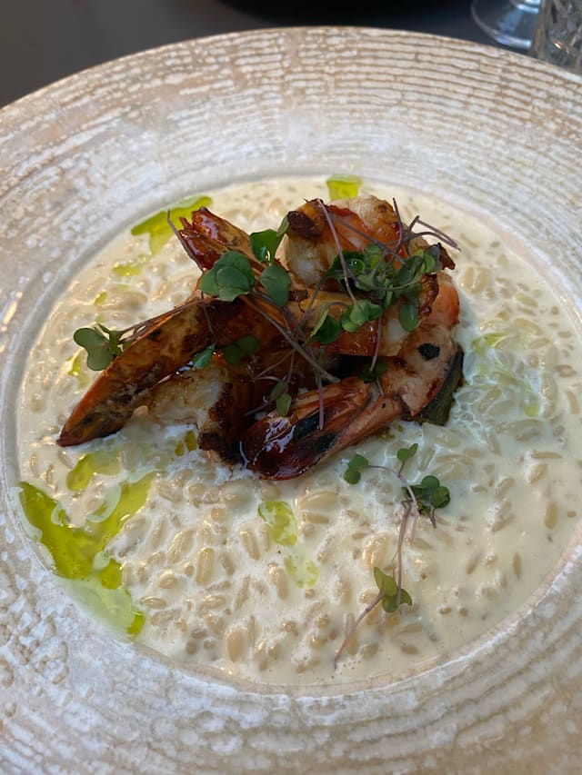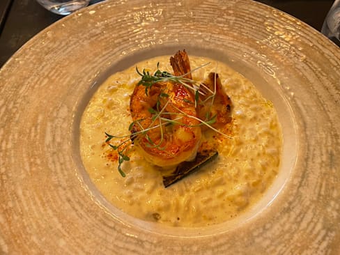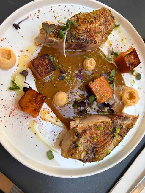 8.5/10The menu was seasonal, reduced in a few options and also very clear in the explanation of the plates, which were always what we expected and very good. I liked a lot my risotto with scampi pastis-flambé. It was also very filling. My partner had a fish filet with asparagus, which was very good, could have been some more in portion. We shared as an entrèe a Brioche with scampi tartar and harissa and the dessert trio. We could feel that there were young people working here that with a reduced menu could focus on deliver a good food and interesting combinations. We liked that the service stuff left us time between dishes and at the begin