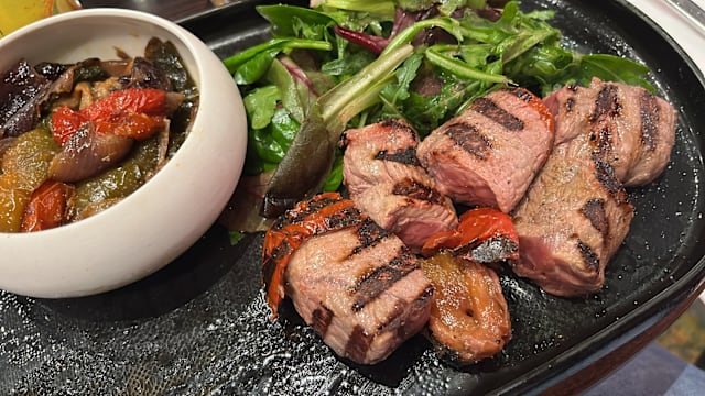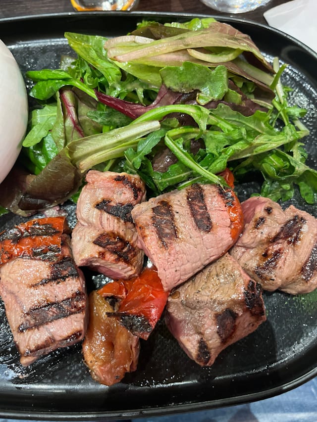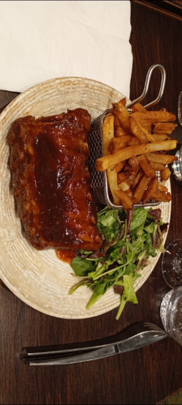 5.5/10The steak was rare ( we ordered medium). Also the food was quite plain. The ribs were pretty tough ( overcooked ). Waitress was unpleasant. Furthermore we were not informed about water prices (7 euro were added to our receipt). We felt not welcome there- we will not visit again.