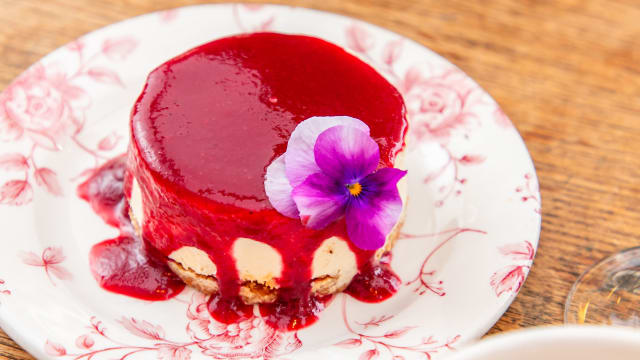 Glace vanille, chantilly mascarpone au citron vert, framboises, crumble, coulis de fruits rouges