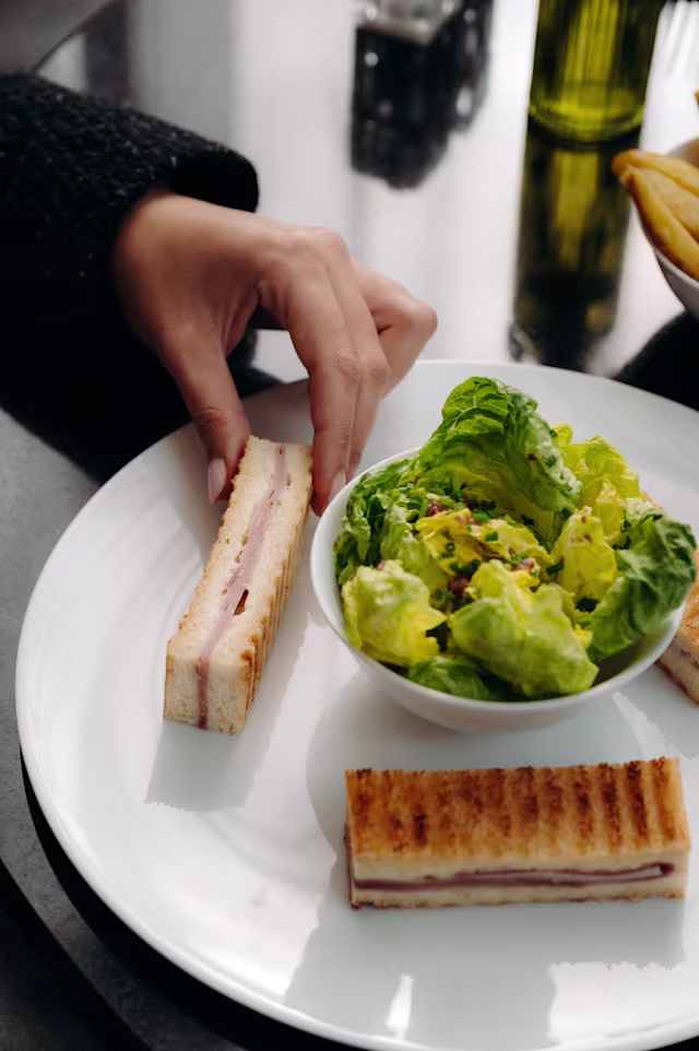 - Pain de mie toasté, salade iceberg, tomates, œuf au plat, émincé de dinde, lard fumé, mayonnaise aux herbes, frites sucrine