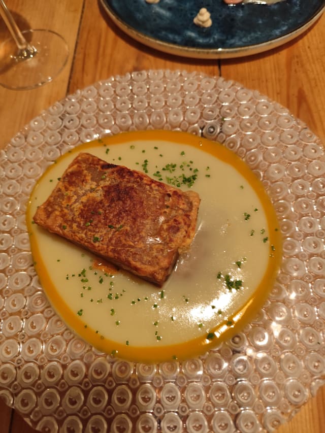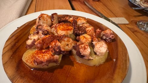 10/10Good service and well prepared food in a very pleasant dinning area. The attention to detail extended to the very tasteful decor with blue and white wall paper and many nice details, don’t miss the WC. The tone is subdued and the music low so it is easy to carry a conversation. We took the elevator up and we’re a little concerned until we arrived at the entrance to the restaurant on the principal floor, we were greeted by nice stained glass and a pleasant ambiance We were here for Sunday lunch and the menu wasn’t very extensive, but it had enough to choose from. We had a couple of appetizers, two main courses, a bottle of water and a bottle of wine , plus some very good Galician bread that came with a tube of olive oil, for around one hundred euros for two people so it is not inexpensive, but it was worth it. I definitely would go back next time we are in Barcelona, there are so many other dishes I would like to try, specially the paella seems like that was a very popular dish.