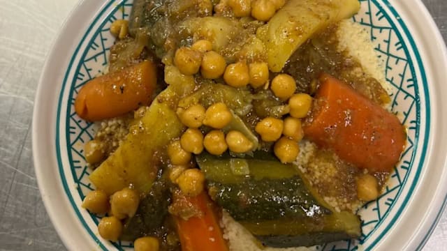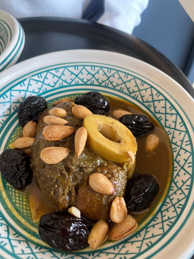 - Tajine de poulet fermier cuit avec des épices marocaines, du safran marocain biologique, des olives, du citron confit et des frites.
