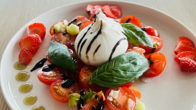 - Burrata, tomates cerises, citron, huile d'olive, crème balsamique, crème de basilic, sel, poivre.