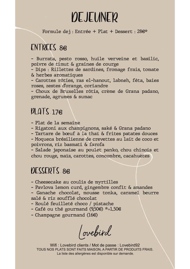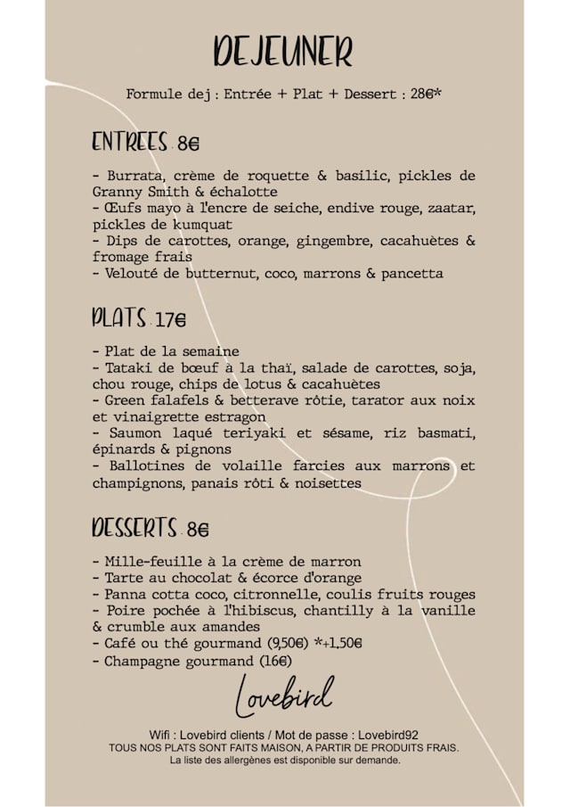 Bienvenue au Lovebird à Saint-Cloud ! Nous vous accueillons dans un lieu chaleureux et convivial, où l’on se sent comme à la maison. Nous cuisinons des plats faits maison, à base de produits frais et de saison, inspirés des saveurs du monde. Le midi, nous proposons un menu avec des plats du jour, y ...