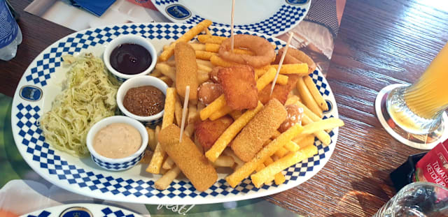 - Patate fritte, crocchette di pollo, anelli di cipolla, polentine croccanti, bastoncini di verdura e formaggio, würstel panati, serviti con insalata di cavolo, salsa BBQ, senape dolce e salsa löwengrube.