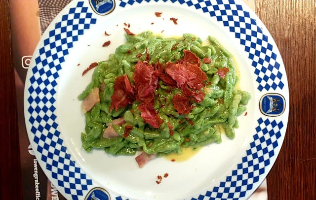- Spätzle agli spinaci con tocchetti di speck saltato in padella e crema di formaggio.
