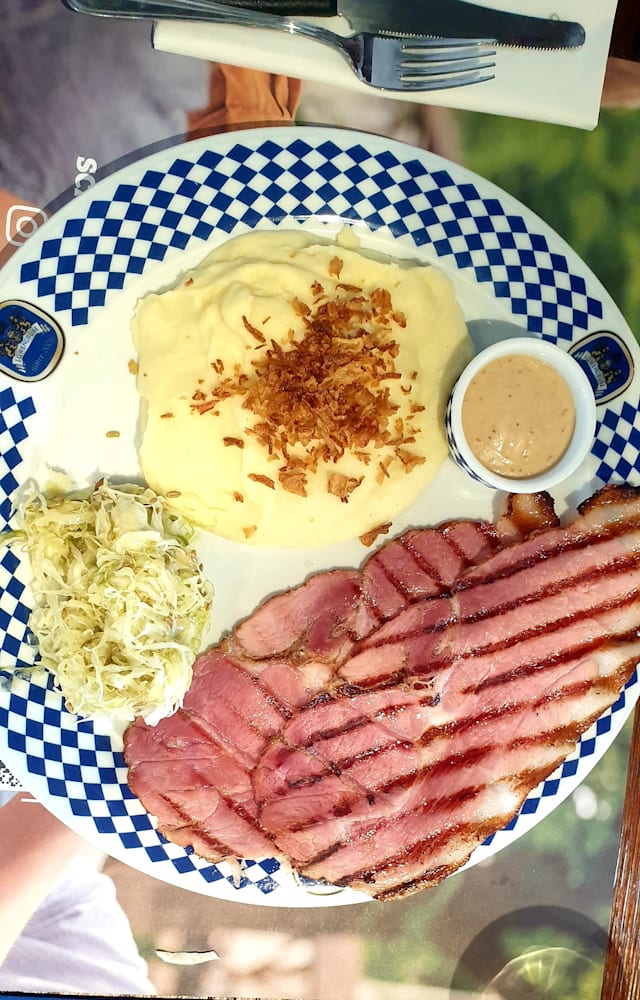 - Carne di maiale tipico della baviera, servito con uovo al tegamino, purè di patate, cipolla croccante, crauti rossi, insalata di cavolo e salsa löwengrube.