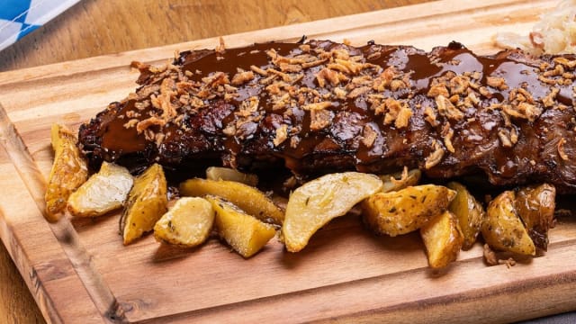 Costine di maiale glassate con salsa BBQ con cipolla croccante, servite con patate fritte e crauti.